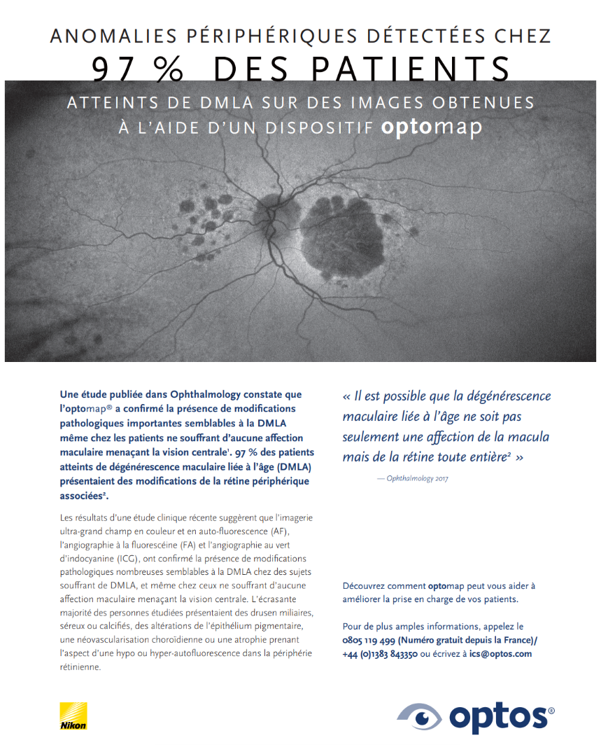 Les images optomap en couleur et auto-fluorescence des sujets inclus dans l’étude « Eye Study » de Reykjavik (Islande) avec un suivi à 12 ans ont été analysées et ont permis de conclure que 67 % des sujets présentaient des modifications périphériques semblables à la DMLA. Par ailleurs, une autre étude, dite OPERA (Optos PEripheral RetinA), a ensuite conclu que les modifications en périphérie étaient plus fréquences dans les yeux atteints de DMLA que les autres. Les drusen et les modifications réticulaires apparaissaient dans 97 % des yeux atteints de DMLA, à la fois dans la périphérie moyenne et lointaine. Ces études contribuent à montrer qu’il est possible que la DMLA ne soit pas seulement une affection de la macula, mais de la rétine tout entière. D’autres recherches montrent également que l’optomap icg permet de saisir des modifications importantes de la périphérie chez 80 % des patients atteints de DMLA. Toutes ces études témoignent des avantages de l’imagerie ultra-grand champ dans le diagnostic et la prise en charge de la DMLA. Des études longitudinales des modifications périphériques associées à la DMLA et leur impact sur la fonction visuelle sont en cours pour mieux comprendre la maladie. Pour plus d’informations concernant ces études, veuillez nous contacter et découvrez comment l’imagerie ultra-grand champ optomap peut aider les professionnels de la vue à détecter et documenter la DMLA plus tôt, et potentiellement modifier le cours de son évolution.