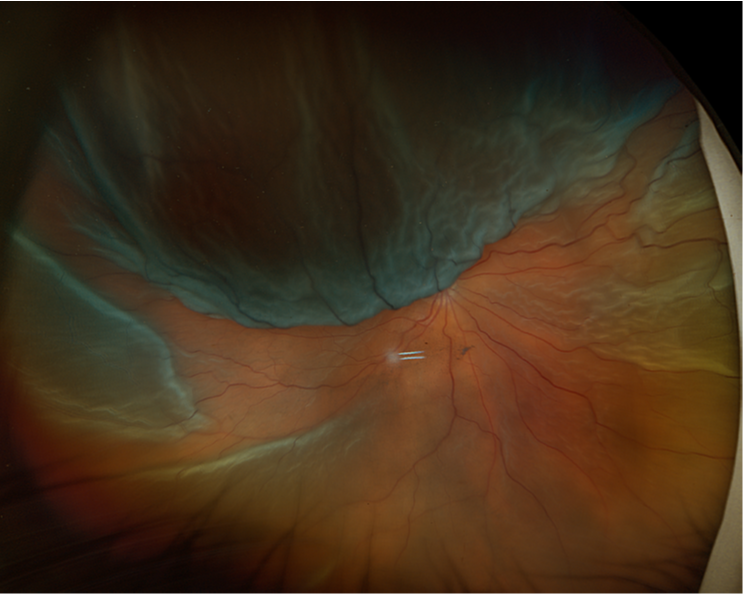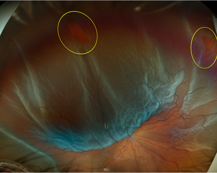 Figure 1. (b) L’orientation du regard vers le haut révèle des déchirures rétiniennes supérieures et supéro-nasales.