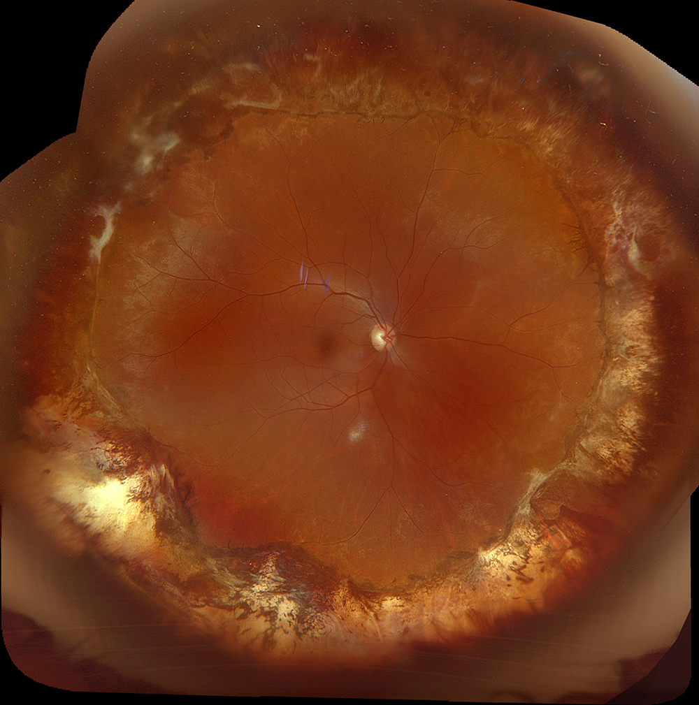 Figure 2. Image UWF RVB avec auto-montage d’un patient après une chirurgie de décollement de la rétine montrant une image panoramique en couleur de presque toute la rétine.